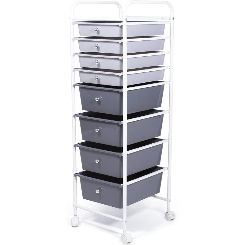 - 8 durable plastic drawers and metal top shelf for display. BPA and phthalate free.