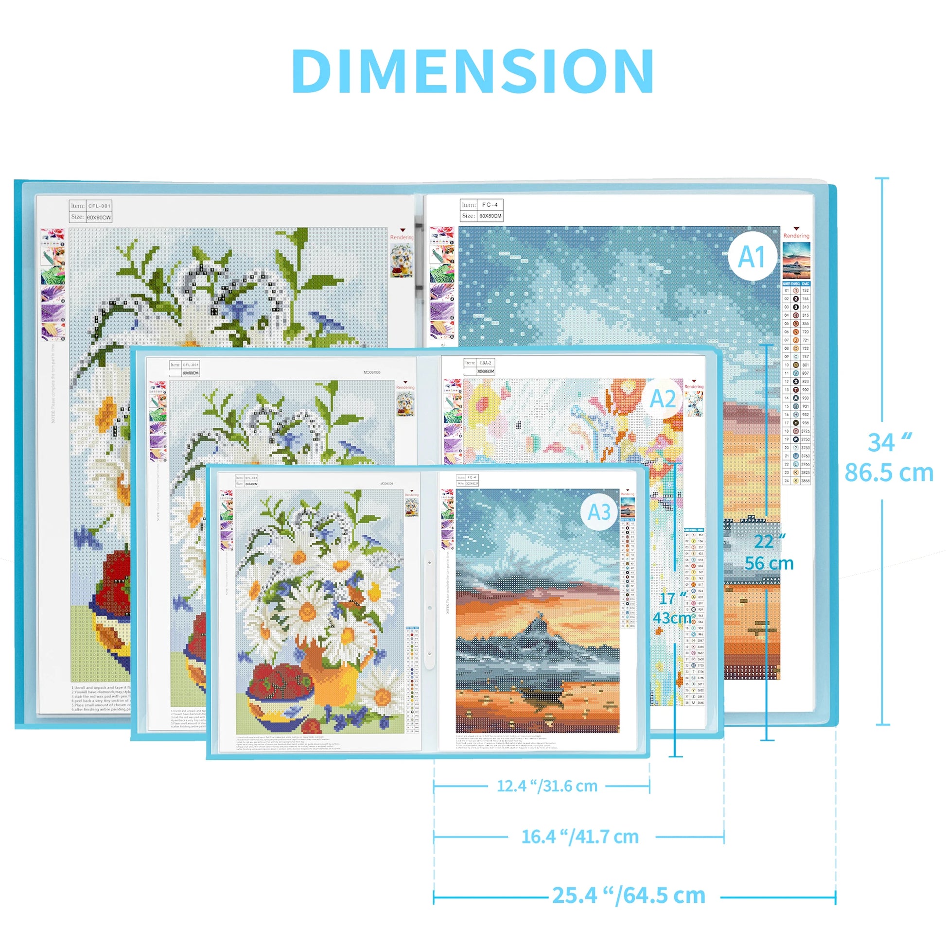 Our diamond painting storage presentation comes with 7 pockets of A1(34'' x 24.6'') and 6 pockets of A2(22'' x 16.4'').