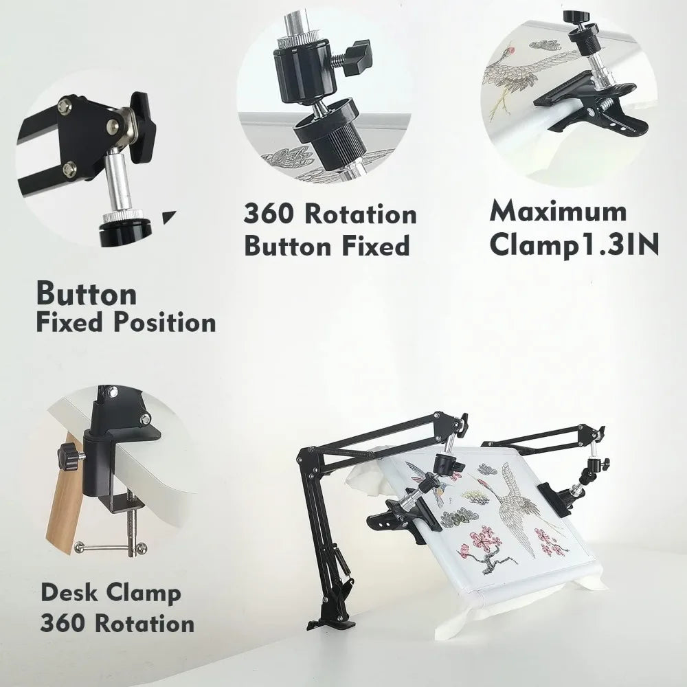 - Cross stitch frame holder stand widely used on a desk, workbench, table, can easily clip to desktop up to 1.96 inches/5 centimeters thickness.