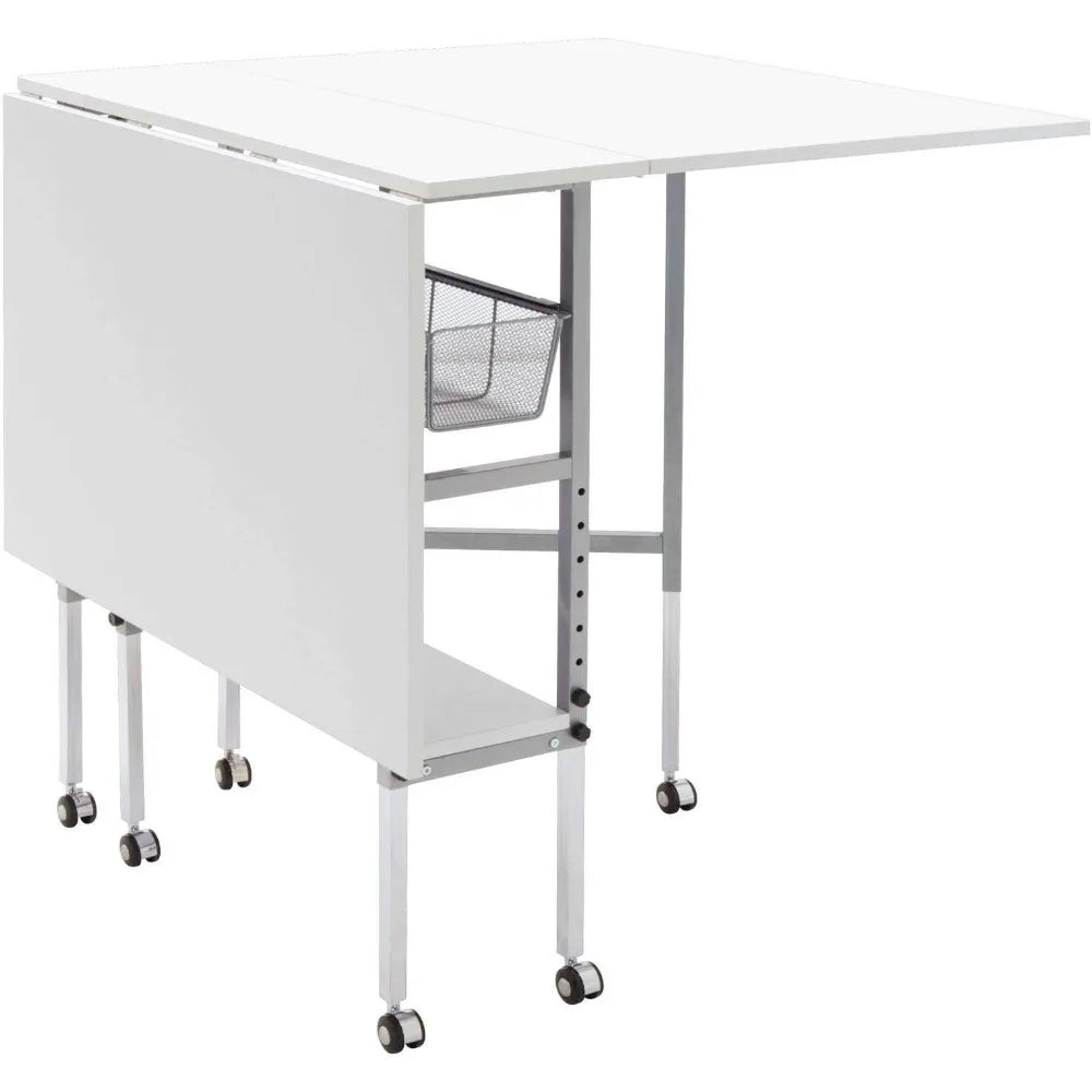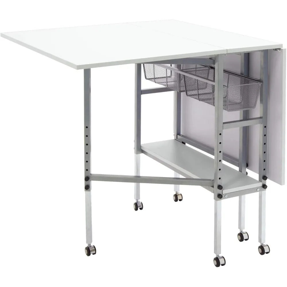 The Sew Ready Hobby and Cutting Table makes finding a place to create easier than ever. Designed with a 58.75" wide and 36.5" deep tabletop when fully extended, this cutting and hobby desk creates the perfect space for spreading out art supplies as you create, sew, cut fabric, adjust patterns, and work on different hobbies. Organize your sewing supplies and keep them handy with the two mesh fabric storage drawers and convenient lower shelf. This crafts table adjusts heights to help provide back relief and comfort while working on longer artistic projects. Make your space your own with the Sew Ready Hobby and Cutting Table. Overall Dimensions: 58.75" W x 36.5" D x 29.75" - 38.75" H (easily folds to 12.25" W) Center Top Dimensions: 10.75" W x 36.5" D Folding Panels Dimensions: 23.75" W x 36.5" D Two Slide-Out Wire Mesh Drawers Dimensions: 7.75" W x 14" D x 4.5" H Bottom Shelf for Storage Dimensions: 7.75" W x 29.5" D