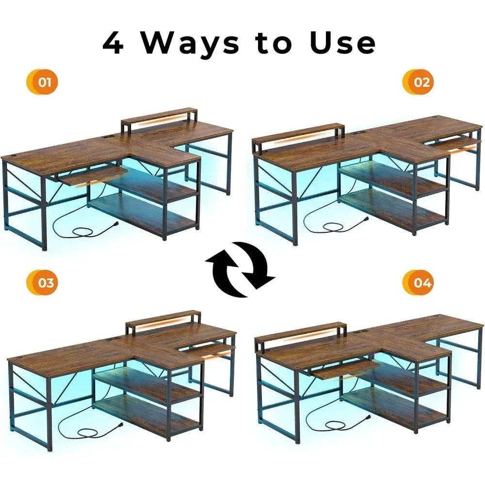 Home Office/Gaming Desk w/Storage, LED Lights, Keyboard Tray & Monitor Stand