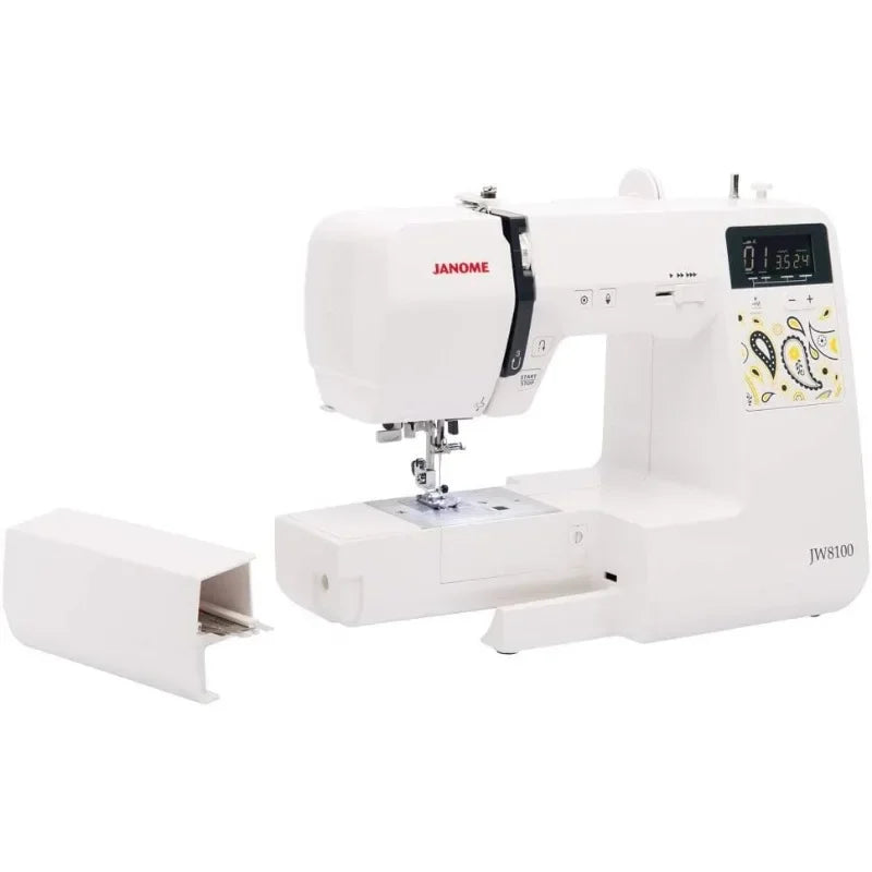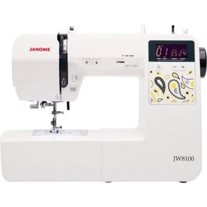 The Janome JW8100 computerized sewing machine is the perfect machine to tackle your next sewing project. The machine's cutting-edge technology ensure that projects are conquered with power, precision and confidence. Utilize the Janome JW8100sewing machine's built-in needle threader, presser foot lift, auto-declutch bobbin winder and 7mm stitch width. The backlit LCD screen with easy navigation buttons make choosing stitches a breeze. The Easy Convenience buttons are located right by the needle, you'll find a start/stop button for sewing without the foot control and a reverse button. There is also a locking stitch button and needle up/down button. The Janome JW8100 advanced sewing machine features basic technology that is perfect for the starting DIY sewist, but can handle a variety of tasks demanded from an experienced user. Bonus Accessories like the Extra-Wide Extension Table, Hard Cover, Even Feed Foot and Quarter Inch Foot provide you with a great value bundle.