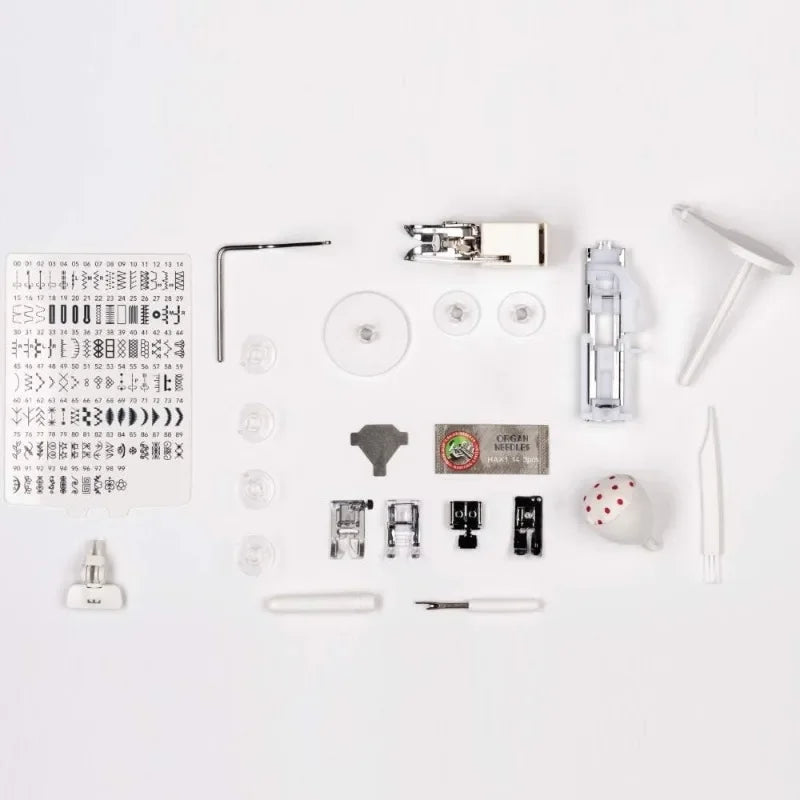 - Included components: Standard Included Accessories: General Purpose Foot (on machine), Zipper Foot, Satin Stitch Foot, Automatic Buttonhole Foot, Spool Holders (large and small), Extra Spool Pin, Bobbins (class 15), Assorted Needle Set, Seam Ripper/Buttonhole Opener, Lint Brush, Screwdriver, Stitch Chart, Instruction Book, Foot Control, Power Cable. Bonus Accessories Included: Extra-Wide Extension Table for managing large projects like quilts. Hard Cover keeps your machine free of dust. The Even Feed Foot is perfect for sewing heavy layers and pattern matching. The Quarter Inch Foot is perfect for quilt piecing. The Pin Cushion attaches to the sewing machine for easy accessibility.