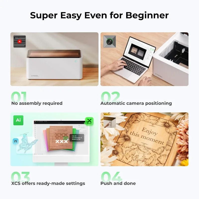 【Easy to operate and batch processing】: Equipped with a high-resolution camera inside, xTool M1 can auto focus, visual processing and creation in just three simple steps. It can also capture images, designs and drawings to create more creative designs, and the AI system can automatically focus and detect the shape of the material, and process the same shape materials in a batch at once!