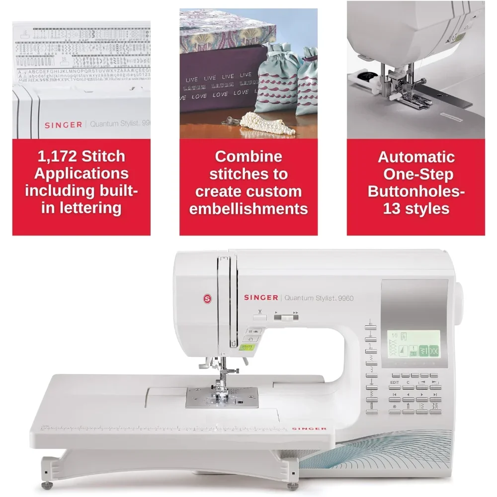 SINGER COMPUTERIZED SEWING MACHINE: The SINGER Quantum Stylist 9960 portable sewing machine has loads of ease-of-use features to allow you to fulfill your creative dreams Has a large selection of stitches including basic, stretch and decorative stitches for fashion sewing, quilting, home decor and crafting There's even a selection of fonts to personalize projects