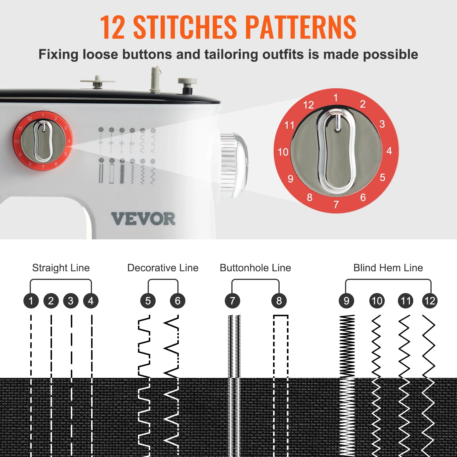 - 12 Kinds of Stitching Fun: Get ready to stitch like never before! Straight, decorative, buttonhole, blind hemlines, etc., for you to customize stitches. All stitch widths and stitch lengths can be preset. Simply adjust the button to the appropriate number to meet your needs. Reverse sewing supported. Sews well up to 6-layer fabrics. All your stitching needs can be met!